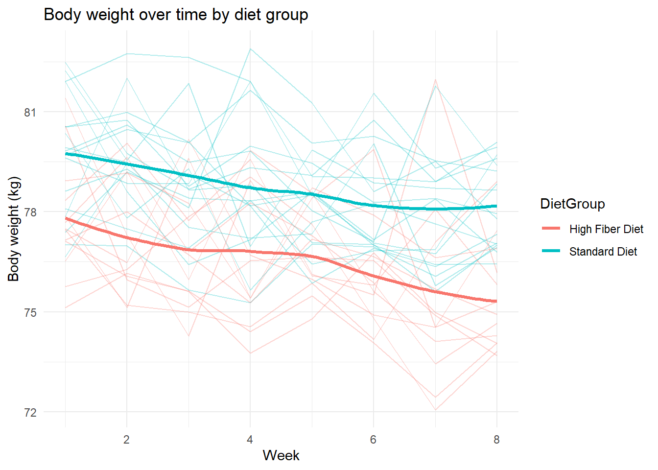 # Set seed for reproducibilityset.seed(123)# Number of participantsn_participants <-30# Number of weeksn_weeks <-8# Diet groupsdiet_groups <-c("Standard Diet", "High Fiber Diet")# Participant-level dataparticipants <-data.frame(ParticipantID =1:n_participants,DietGroup =sample(diet_groups, n_participants, replace =TRUE),Age =round(rnorm(n_participants, mean =40, sd =12)))# Expand to weekly observationsdiet_data <- participants[rep(1:n_participants, each = n_weeks), ]diet_data$Week <-rep(1:n_weeks, times = n_participants)# Generate body weight (kg)diet_data$BodyWeight <-with(diet_data, { baseline <-ifelse(DietGroup =="Standard Diet", 80, 78) age_effect <-0.08* (Age -40) week_effect <--0.3* Week noise <-rnorm(nrow(diet_data), mean =0, sd =1.5) baseline + age_effect + week_effect + noise})# Probability of gastrointestinal side effectsgi_prob <-plogis((diet_data$BodyWeight -75) /5)diet_data$GISideEffect <-rbinom(nrow(diet_data),size =1,prob = gi_prob)# Check datahead(diet_data)