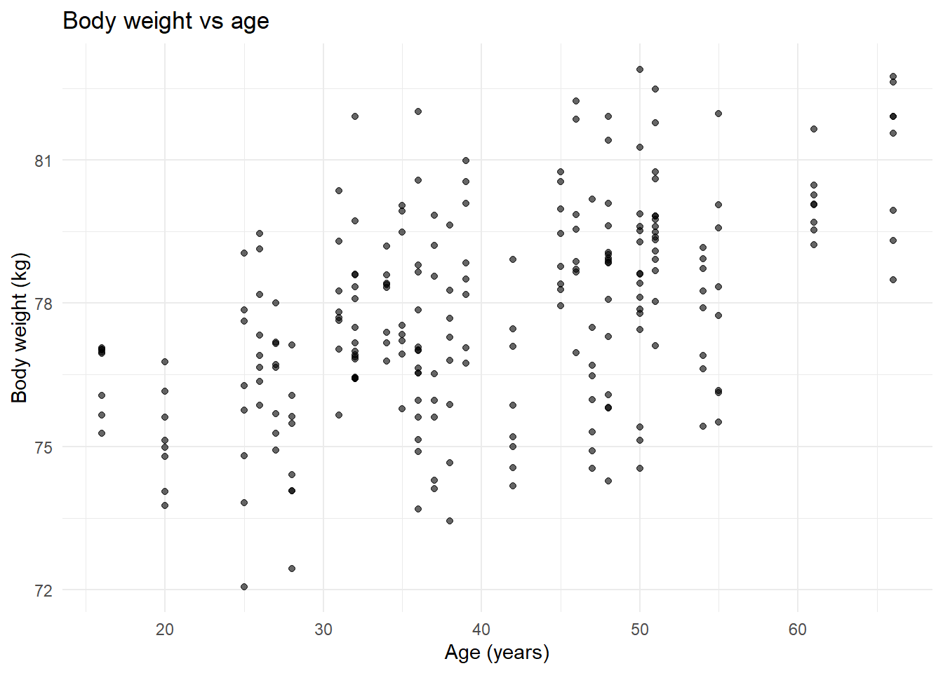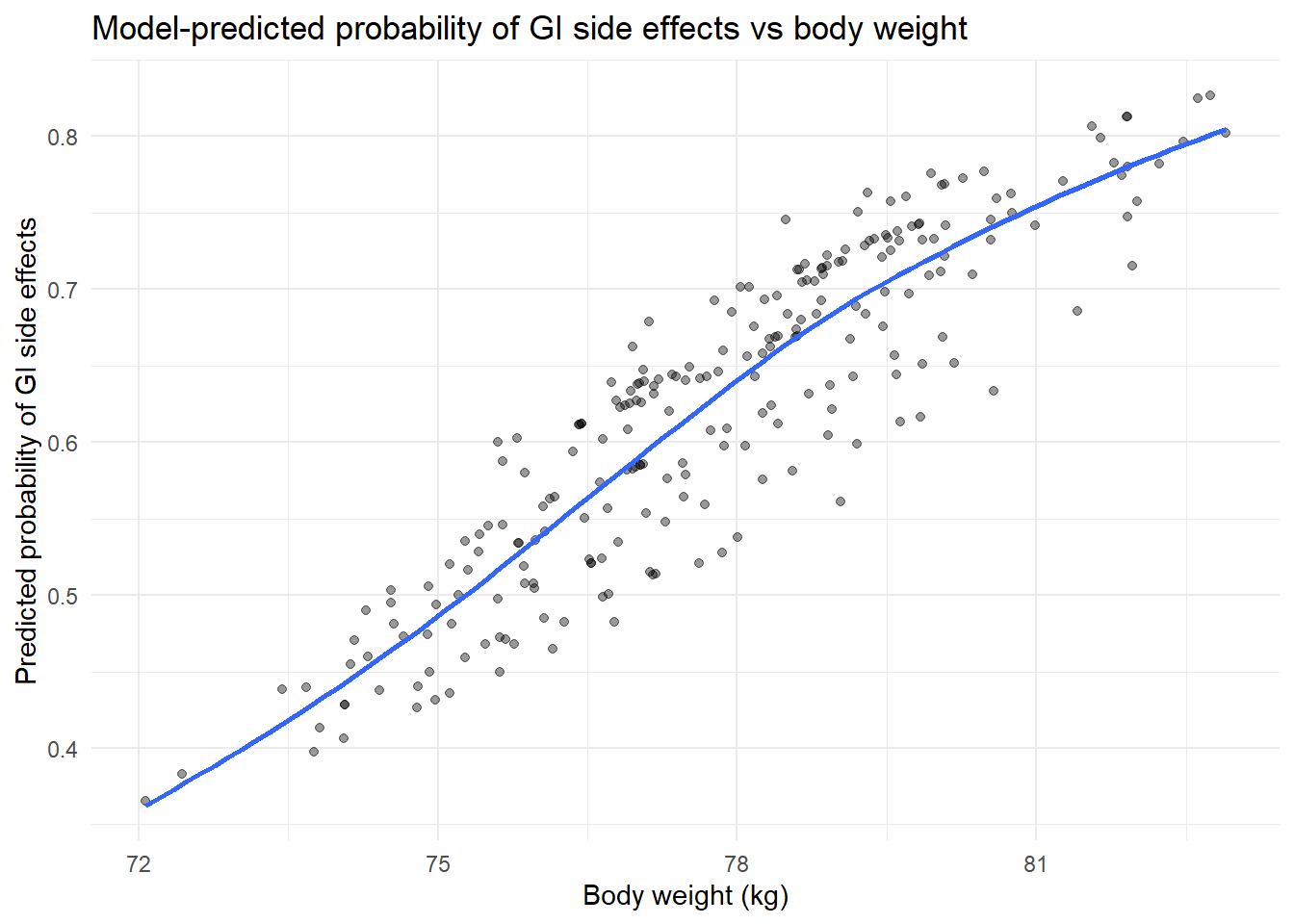 ggplot(diet_data,aes(x = BodyWeight, y = PredictedProbGI)) +geom_point(alpha =0.4) +geom_smooth(se =FALSE) +labs(title ="Model-predicted probability of GI side effects vs body weight",x ="Body weight (kg)",y ="Predicted probability of GI side effects" ) +theme_minimal()