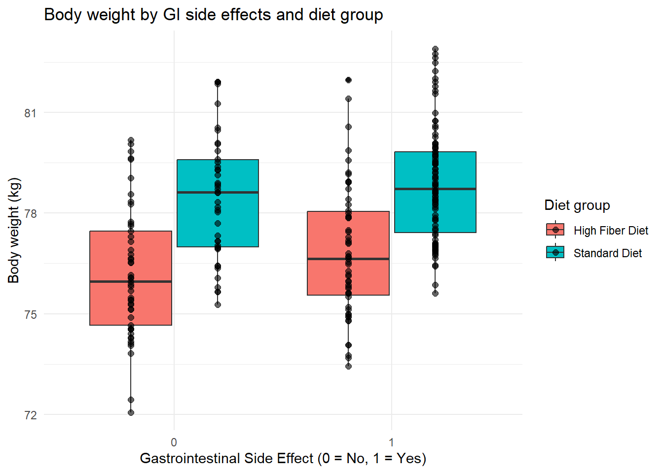 ggplot(diet_data,aes(x =as.factor(GISideEffect),y = BodyWeight,fill = DietGroup)) +geom_boxplot(position =position_dodge(width =0.8)) +geom_point(position =position_dodge(width =0.8),alpha =0.6, size =2) +labs(x ="Gastrointestinal Side Effect (0 = No, 1 = Yes)",y ="Body weight (kg)",title ="Body weight by GI side effects and diet group",fill ="Diet group" ) +theme_minimal()